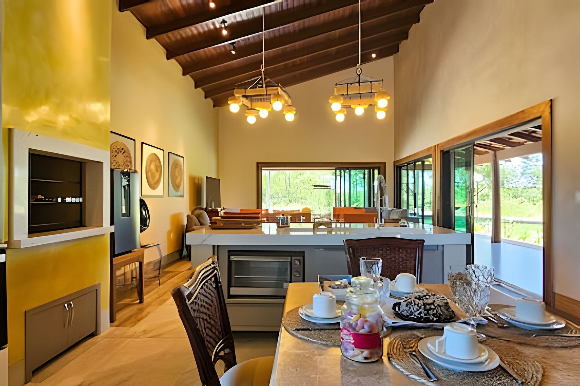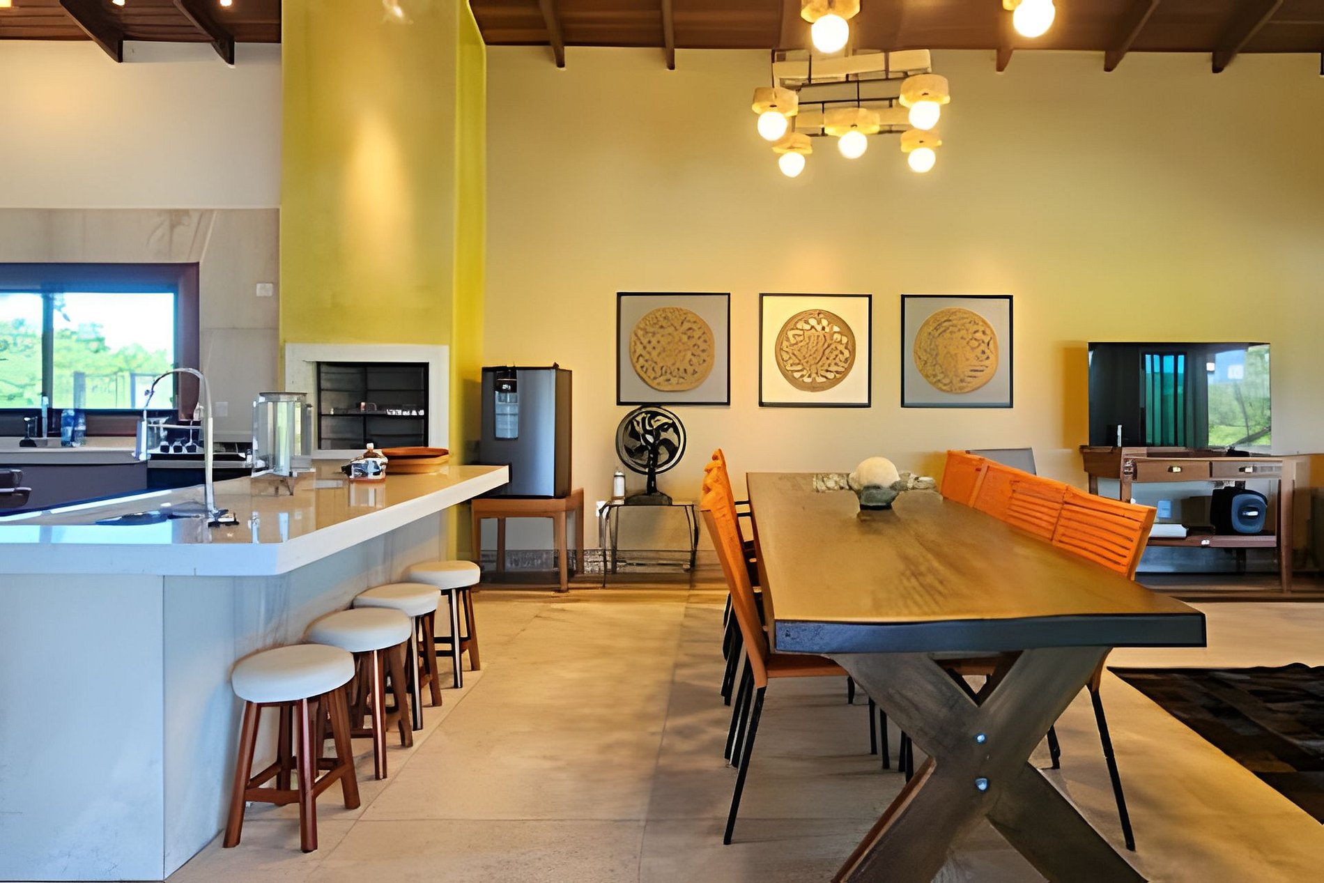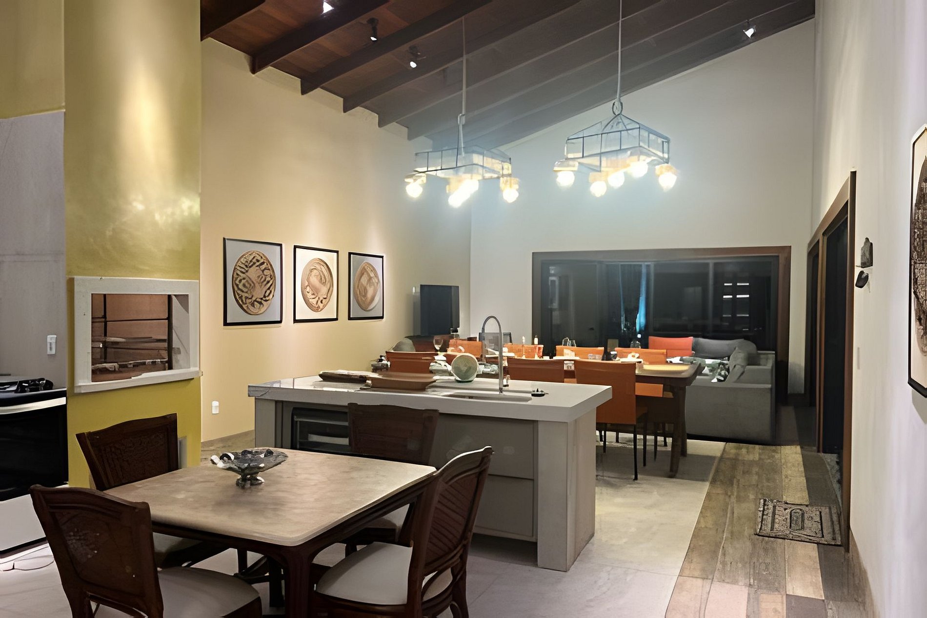 Sala de estar e TV, junto a Sala de jantar e integrada com a Cozinha completa, com churrasqueira e balcão em ilha.