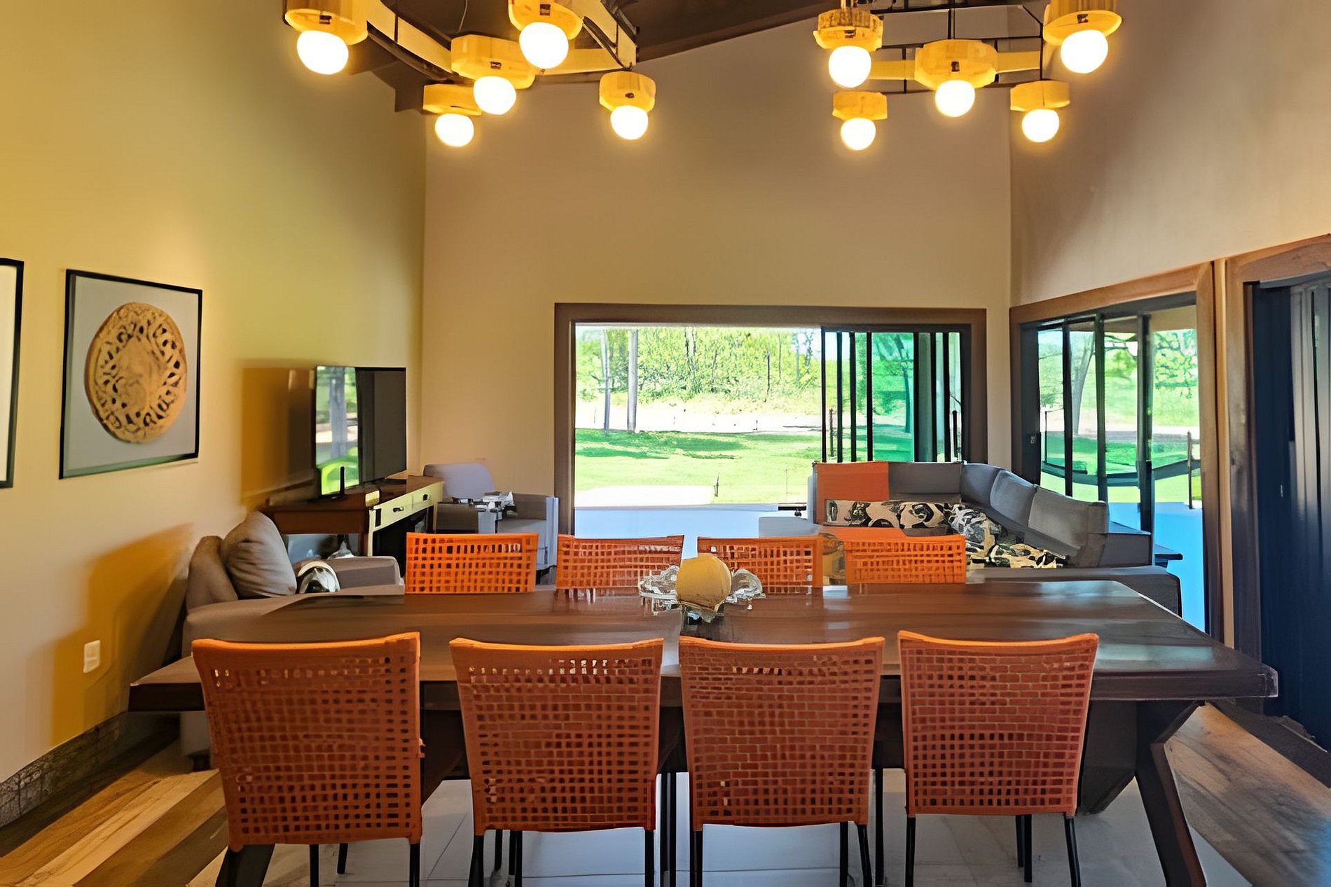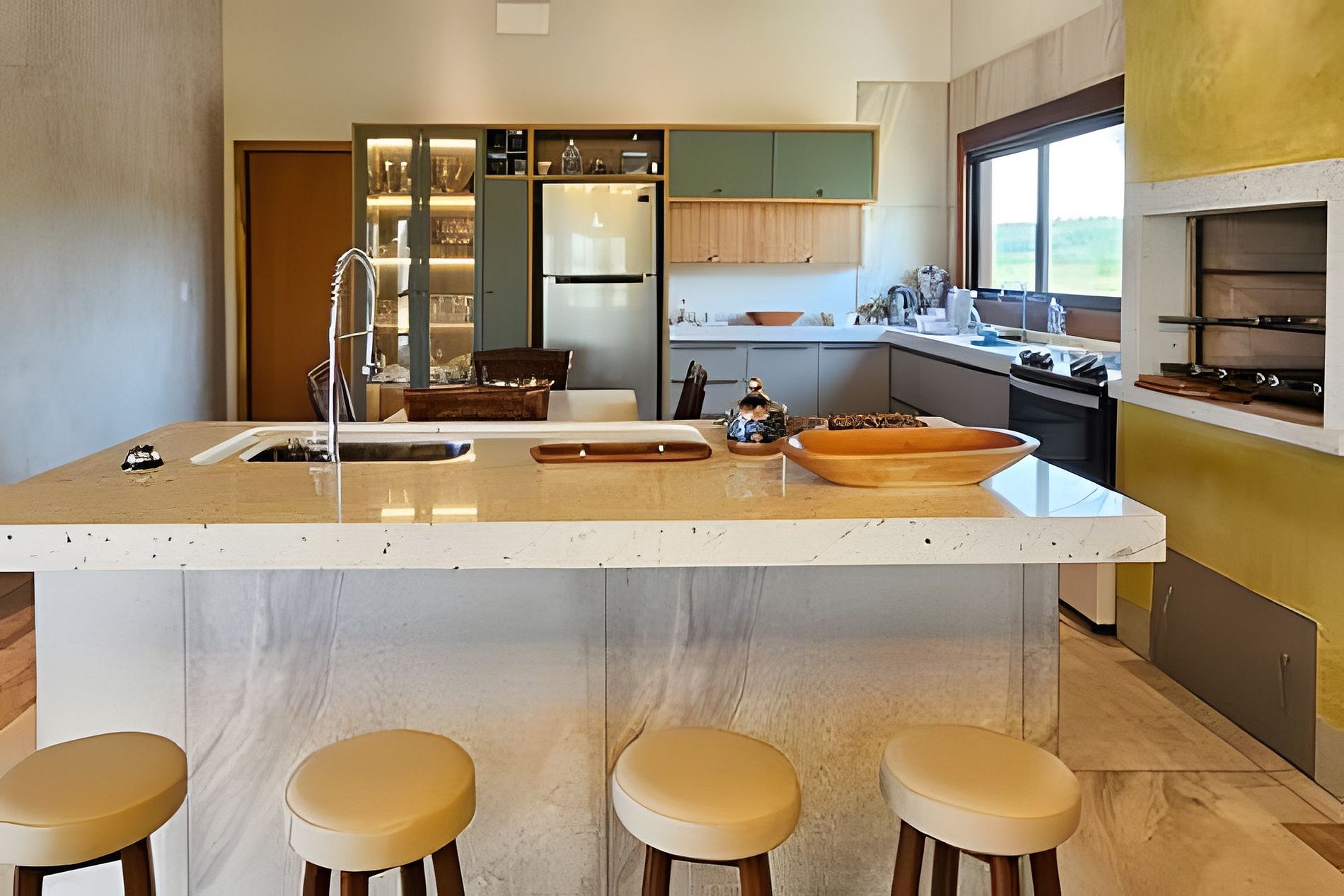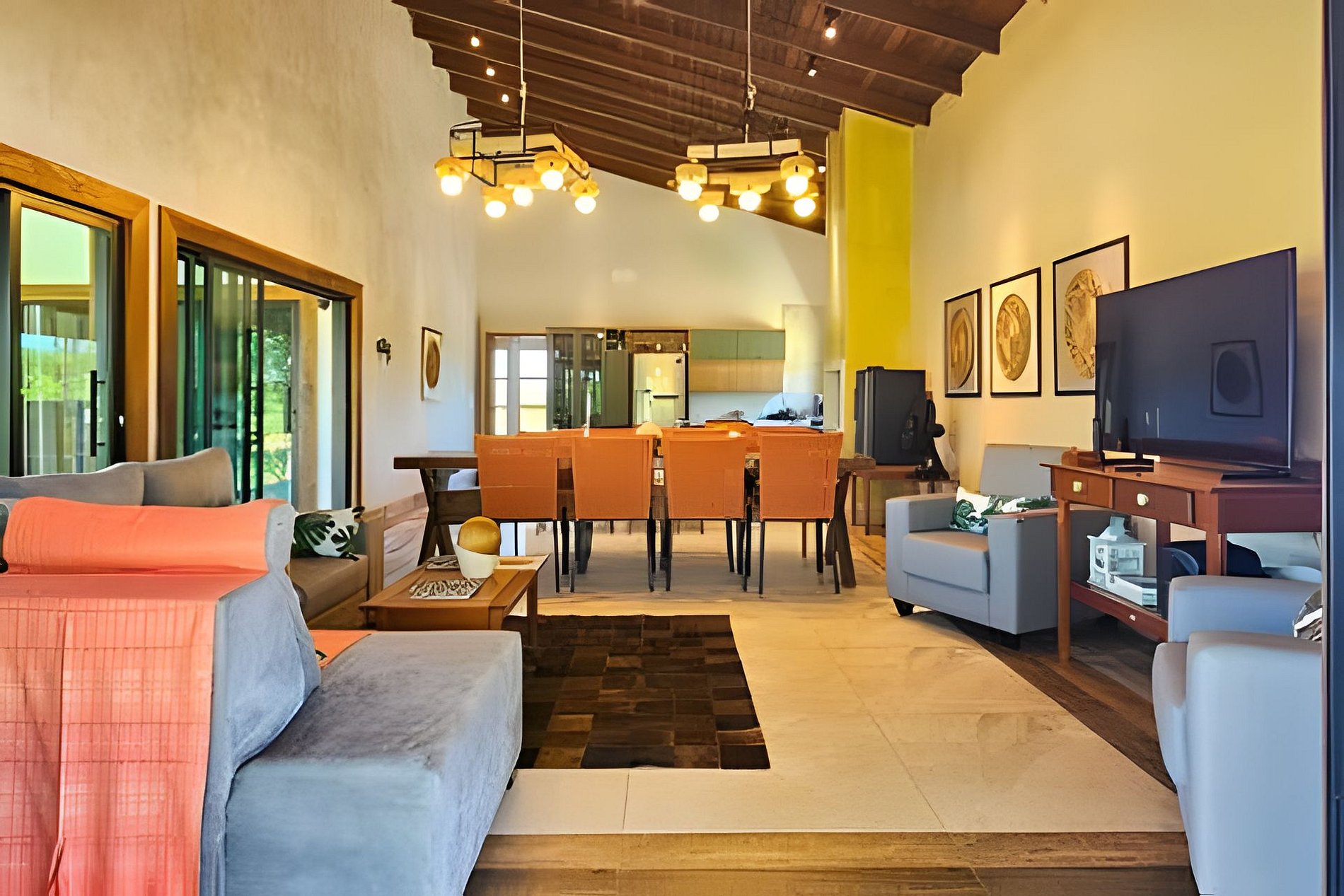 Sala de estar e TV, junto a Sala de jantar e integrada com a Cozinha completa, com churrasqueira e balcão em ilha.