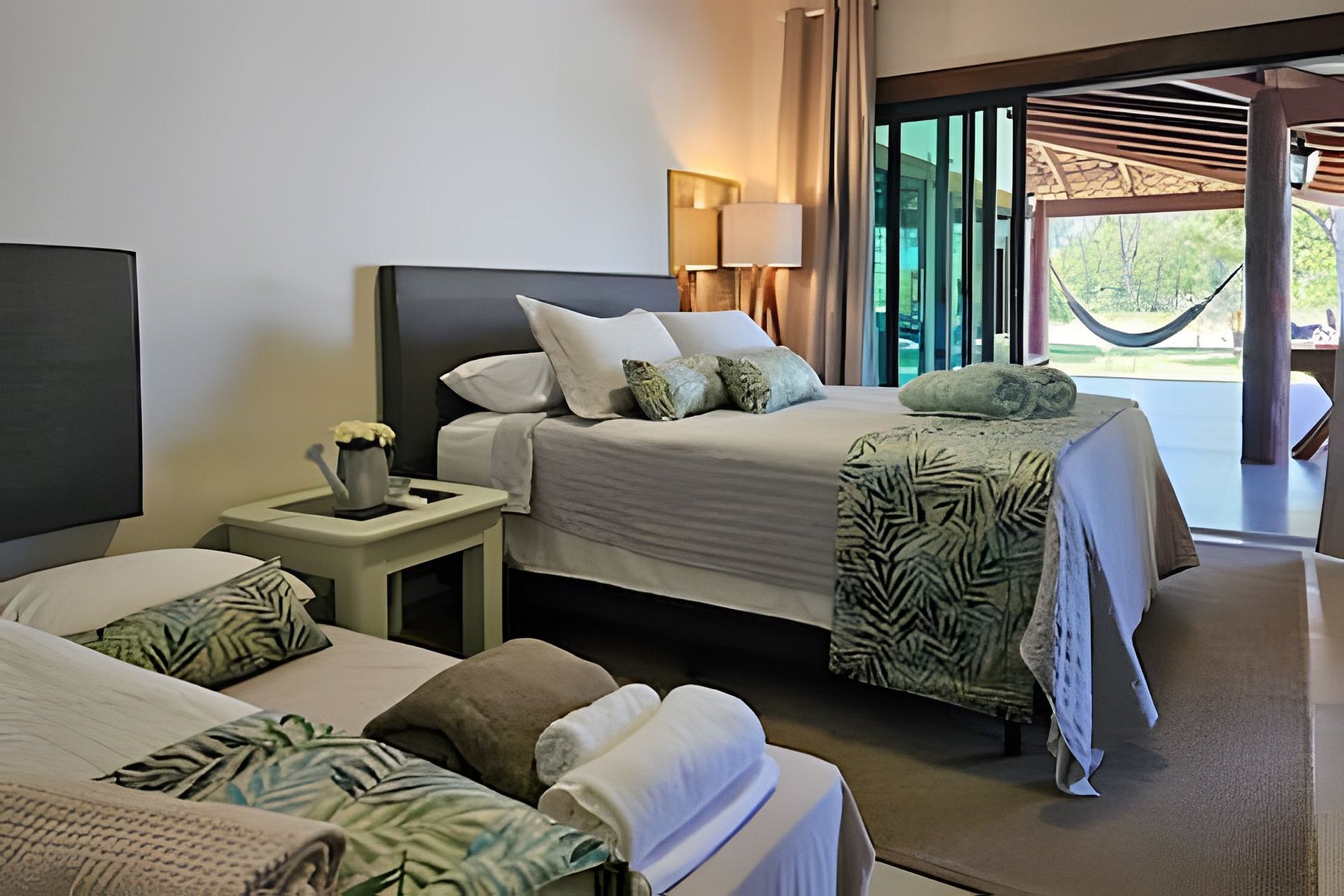 1 Suíte Master com 1 Cama Queen, 1 cama de solteiro e 1 cama auxiliar, TV, banheiro com 2 cubas, chuveiro quente e chuveiro externo, esta maravilhosa suíte tem uma belíssima vista do por do sol e acesso a Jacuzzi.