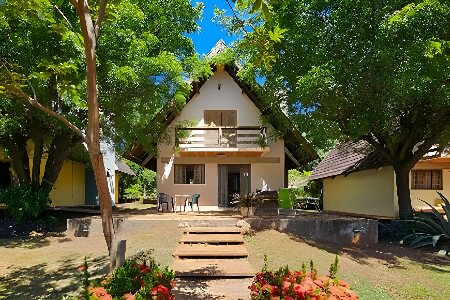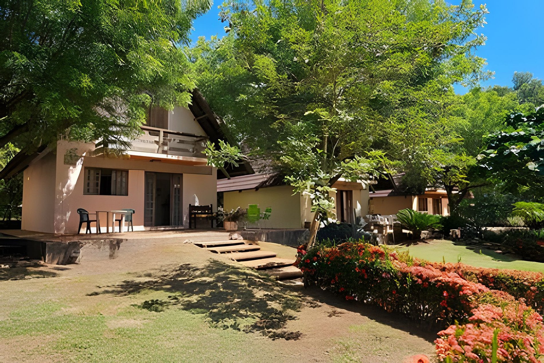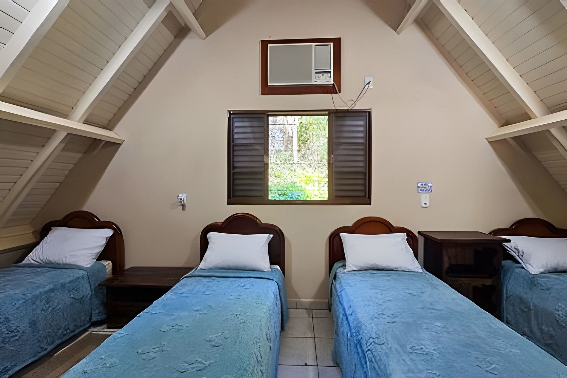 O Chalé 2 combina alvenaria e madeira para criar um ambiente acolhedor e completo. Acomoda até 8 pessoas com privacidade em dois níveis: no térreo, quarto de casal e banheiro; no piso superior, dois dormitórios ventilados com vista para o jardim e um segundo banheiro. Todos os quartos têm ar-condicionado.