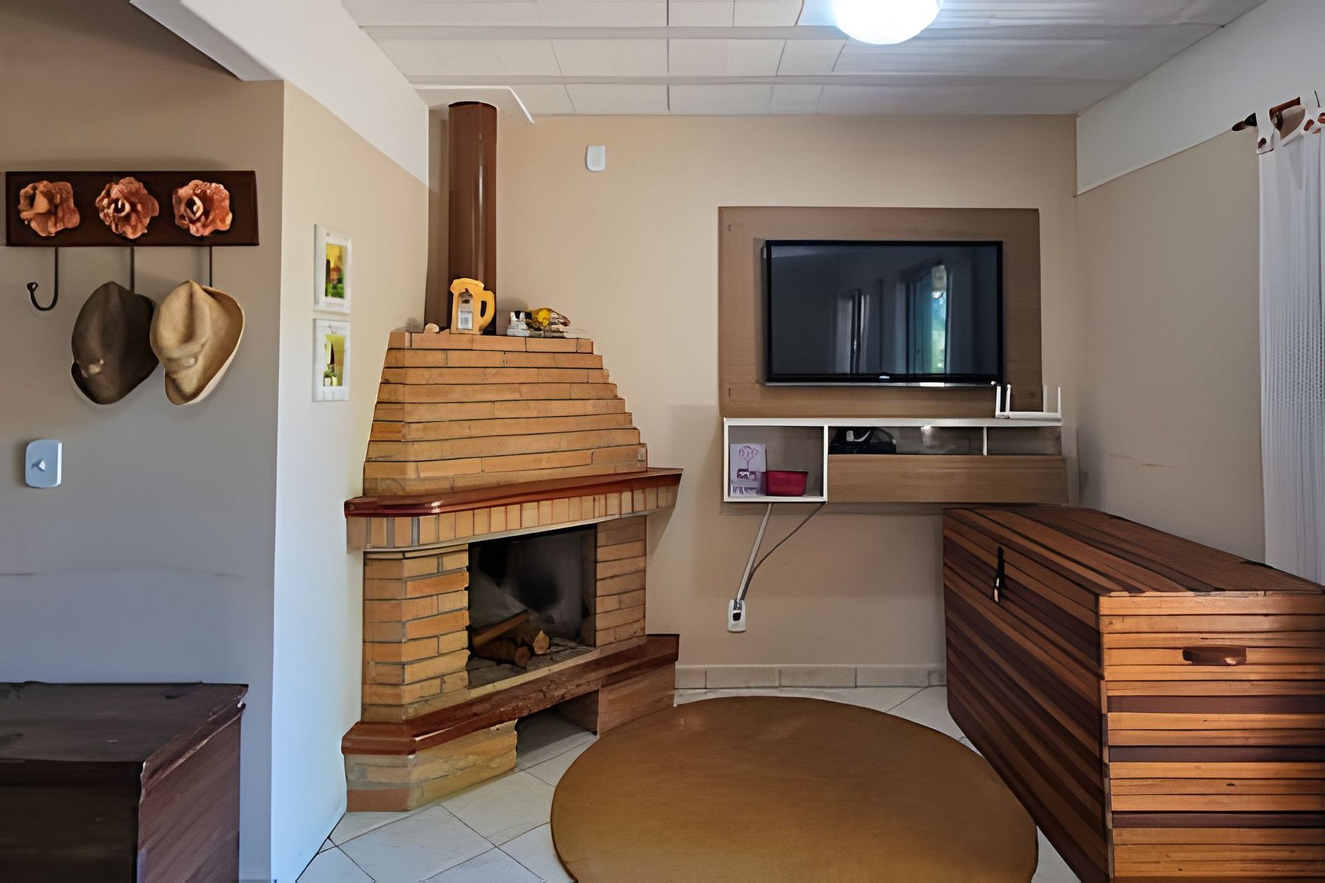 A sala com lareira é o destaque, ideal para relaxar nos dias mais frescos. A cozinha é totalmente equipada, e o pátio privativo em frente ao chalé oferece um ótimo espaço para descanso ao ar livre.