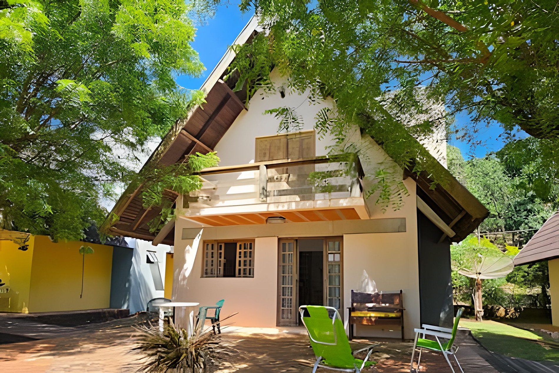 O condomínio de Chalés Bem Brasil, é composto de 4 chalés individuais, um jardim incrível, bosque, redário, parquinho infantil, Espaço Gourmet e estacionamento à sombra de um pergolado.
