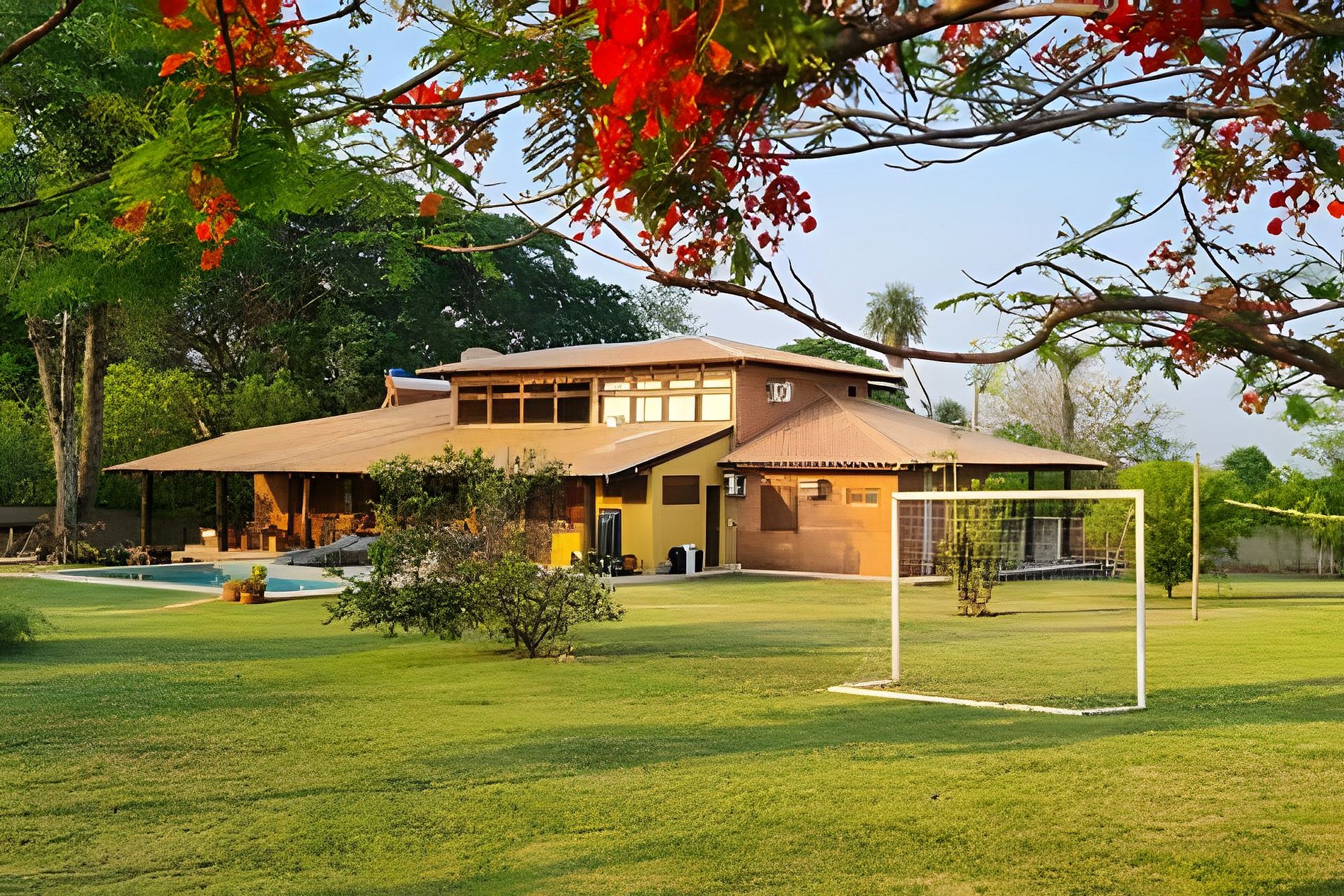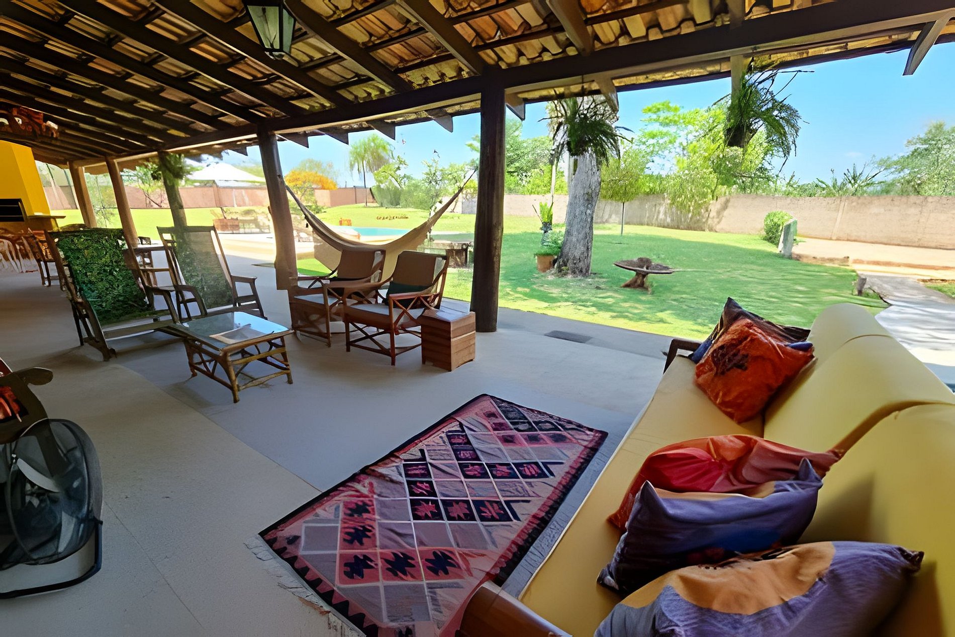 Uma grande varanda com vista para pisicina e para o grande jardim gramado, com traves de futebol e rede de vôlei.