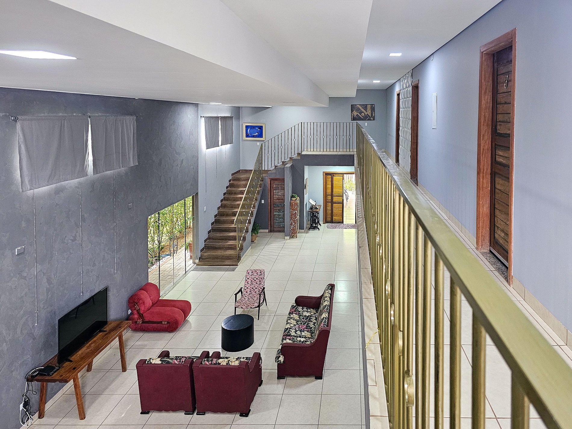 No andar superior são 3 suítes muito espaçosas, cada uma equipada com, TV, ar condicionado, frigobar, secador de cabelo e cortinas black out.