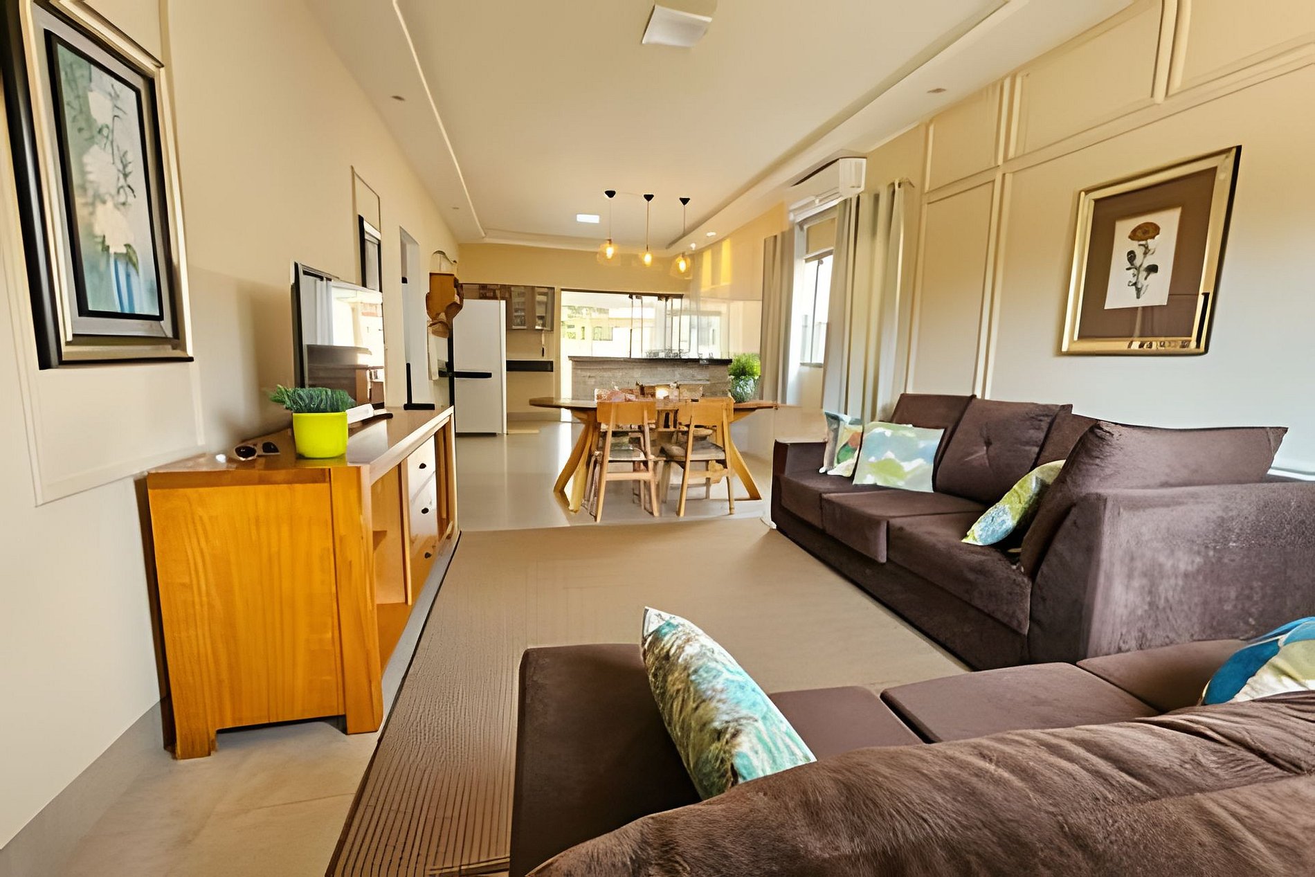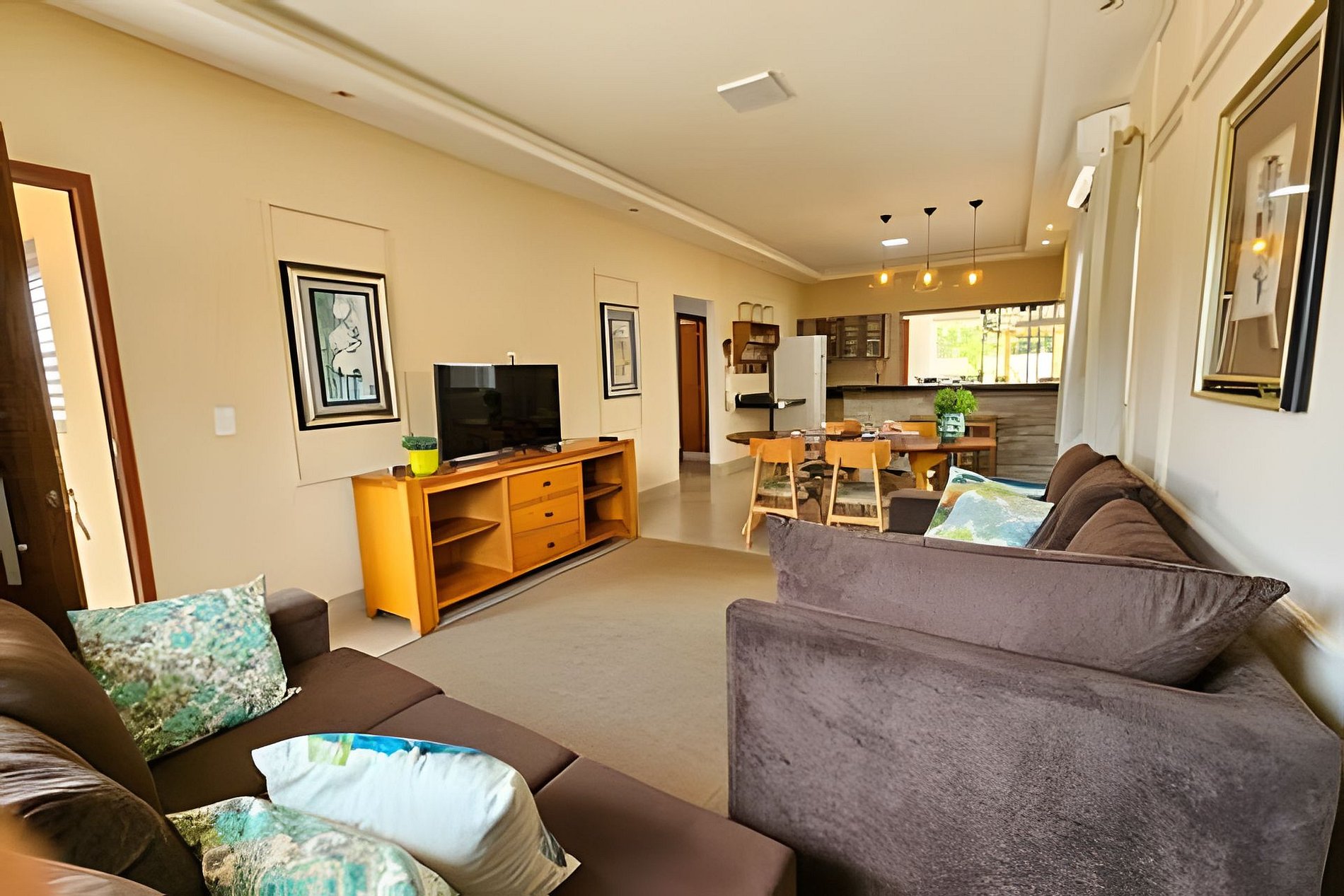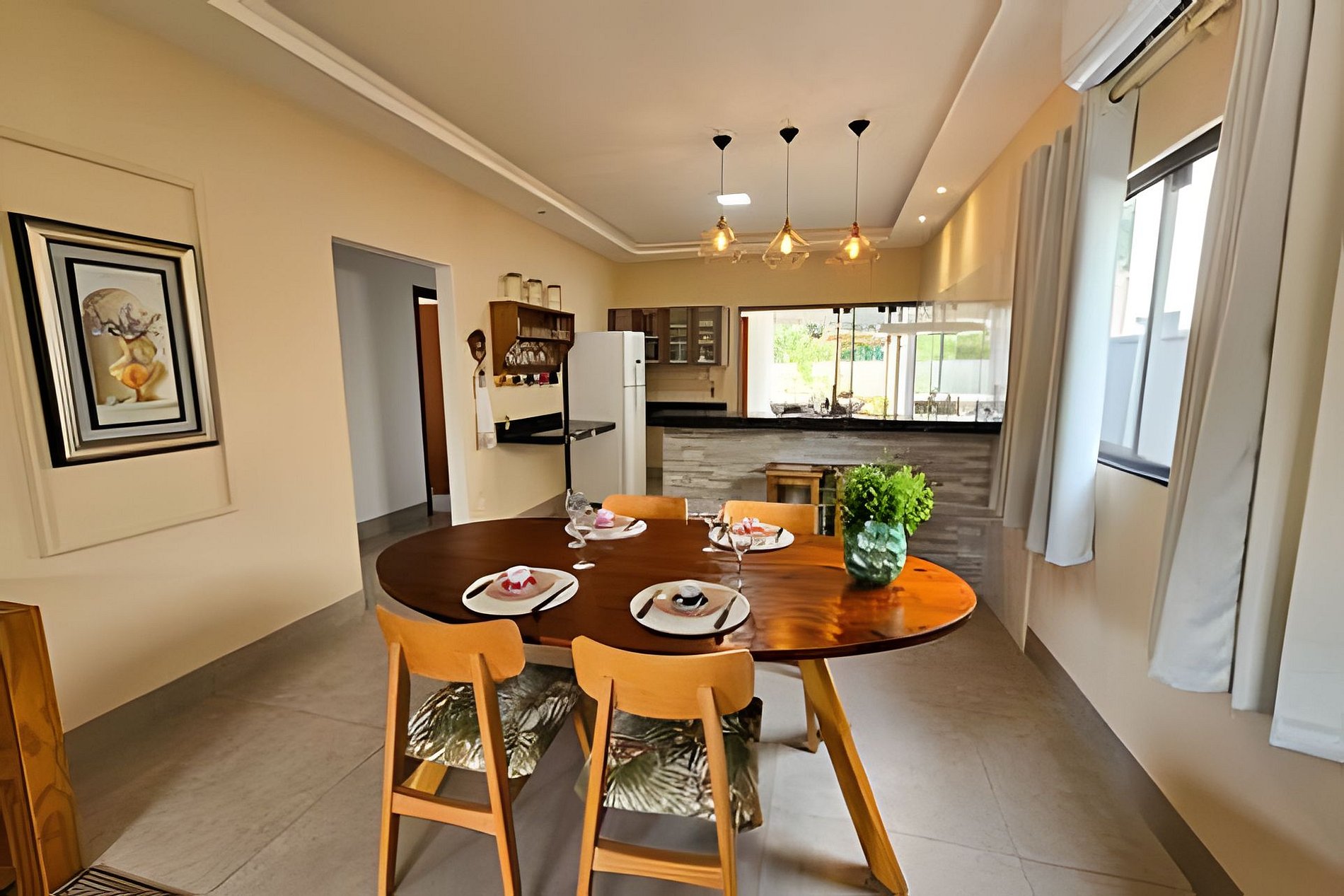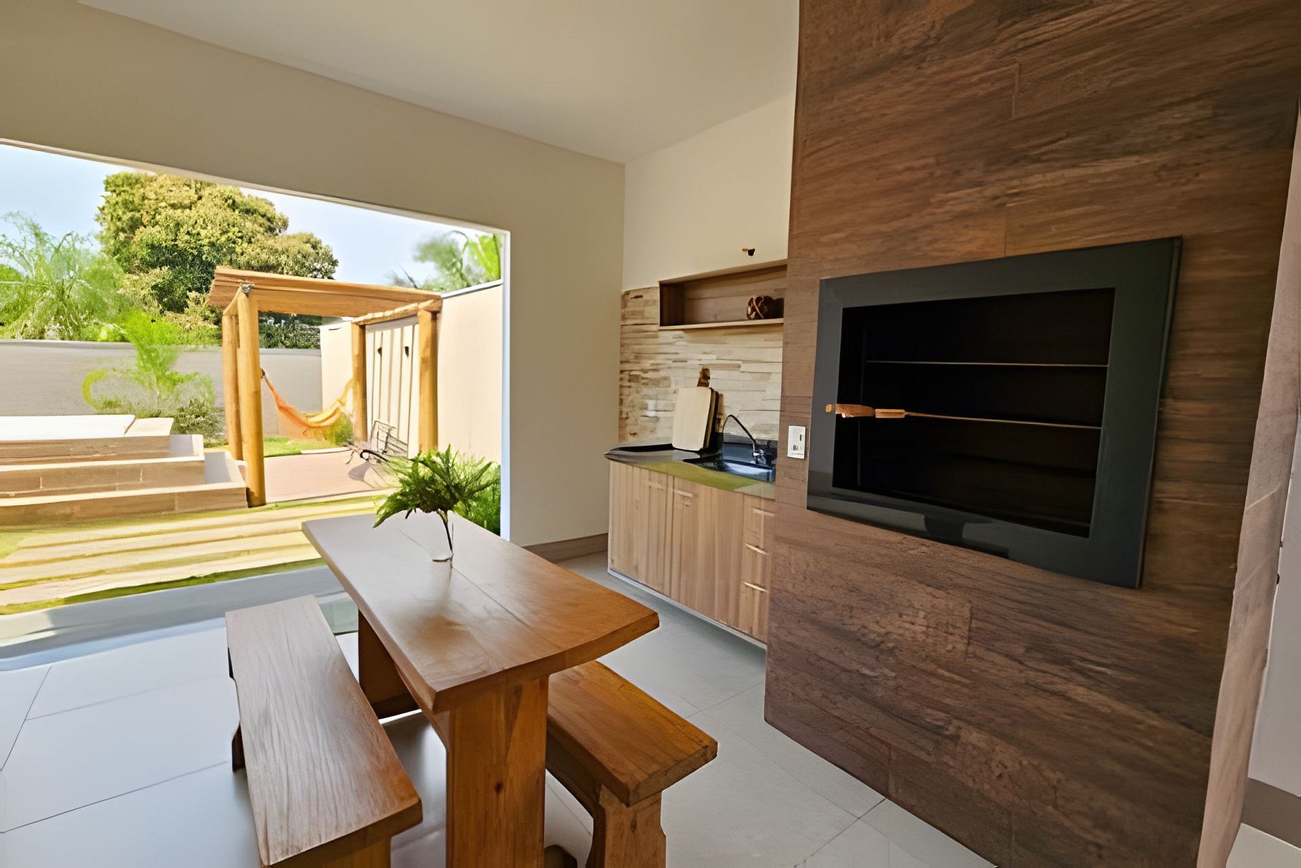 A Casa da Dora possui uma sala com ar condicionado, TV Smart, mesa de jantar e cozinha americana, com ligação para o espaço Gourmet com churrasqueira, piscina, rede e um belo gramado.
