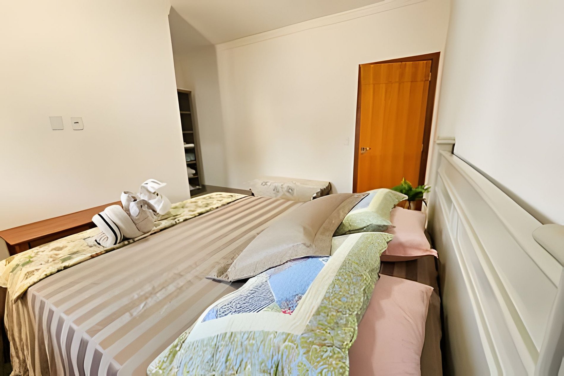 Acomoda até 8 pessoas em 1 suíte com 1 cama de casal, 1 quarto com 1 cama de casal e 1 de solteiro, 1 quarto com 1 cama de solteiro e 1 bicama e 1 banheiro social;
