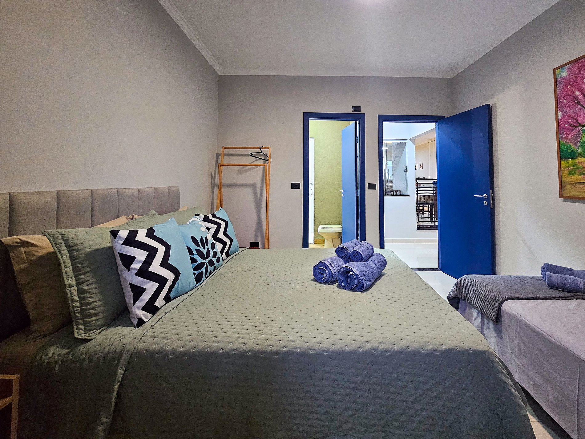 Acomoda 9 pessoas em 1 suíte com 1 cama Queen + sofa cama de casal, 1 quarto com 1 cama Queen e 1 de solteiro auxiliar, 1 quarto com 1 cama de casal e 1 cama de solteiro.